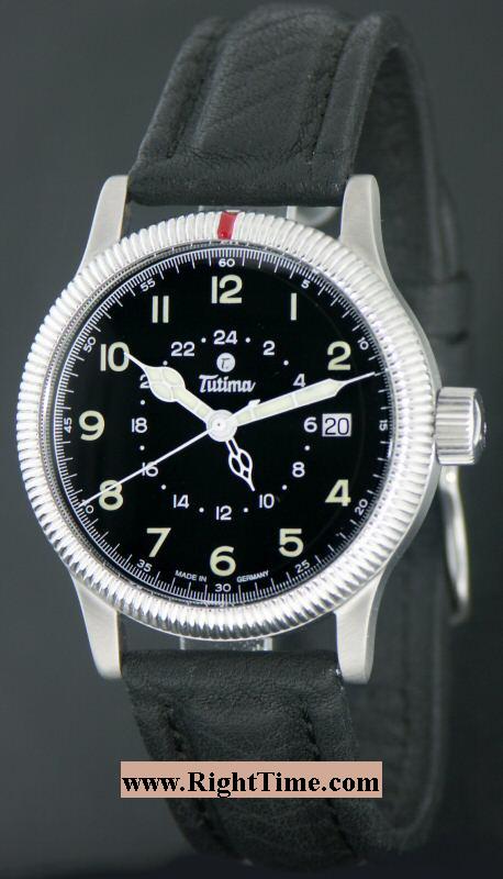 Traditional, favorite with pilots for its simplicity, Tutima German Flieger UTC two time zone automatic watch on heavy duty leather strap