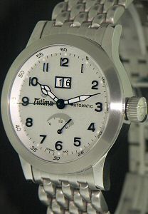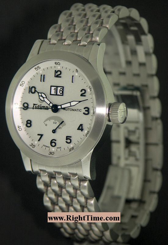Tutima FX "Valeo" German automatic wrist watch with Power Reserve indicator hand at "6" and Grande Date display at "12". Solid stainless steel case with observation case back and sapphire crystal. Silver dial with blued raised Arabic numerals, stainless steel Flieger style watch bracelet with signed deployant buckle.