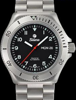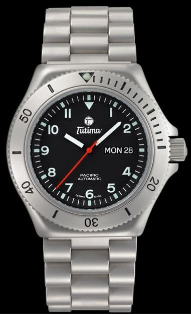 Tutima Pacific model 677-03. ETA Cal. 2836-2 25 jewels Swiss Automatic movement with Day/Date calendar. Large 43mm stainless steel case with watch bracelet, unidirectional ratchet bezel, sapphire crystal. Black dial with luminous Arabic numerals. Water resistant to 20 bar.