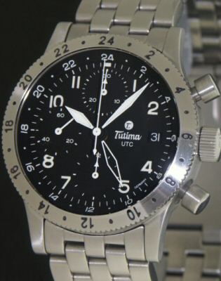 Tutima FX UTC 3 time zones model powered by an ETA Valjoux 7750 based Swiss Automatic chronograph movement with date calendar and Second Time Zone 24 hour hollow pointer hand. Stainless steel case with bi-directional 1-24 rotating bezel as 3rd time zone, screw-down crown and solid engraved case back. Black dial with luminous hands and Arabic numerals. Stainless steel watch bracelet with sport buckle. New, factory refurbished.