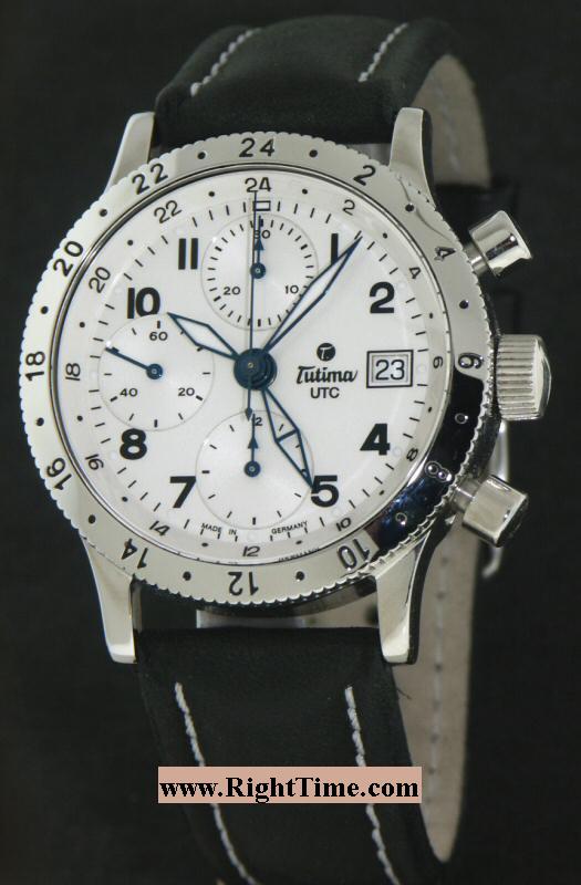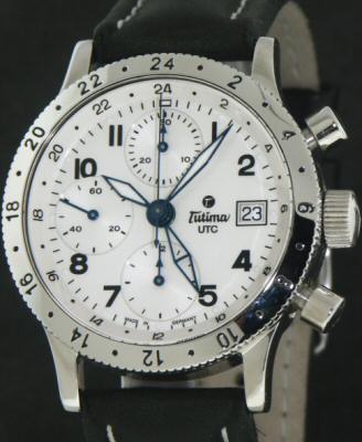 Tutima FX with 3 time zone indicator. Powered by modified Valjoux 7754 modified 7750 with UTC second time zone hand. Polished stainless steel case and 24hr rotating bezel. Looks sharp with a bright color alligator bands.