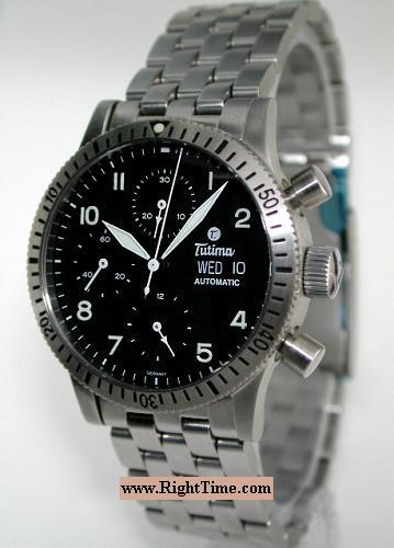 Tutima Refurbished (because of the solid back)Automatic chronograph watch from Tutima FX Line. ETA Valjoux 7750 Swiss Automatic chronograph movement with date calendar. Stainless steel case with 0-60 rotating bezel, screw-down crown and case back. Black dial with luminous hands and Arabic numerals. Stainless steel watch bracelet with tri-fold deployment clasp and spring release. Available with leather watch strap.