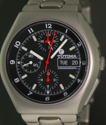Refurbished Tutima Military Air Force Chronograph T. This watch is powered by LEMANIA Cal. 5100 17 jewels Swiss Automatic movement with chronograph, military 24 hour format hand, Day/Date calendar functions. Pure titanium case with screw-down crown. Black dial with Arabic numerals, luminous hands and markers. Titanium watch bracelet with tri-fold deployment clasp with security flip-lock and over-the-wetsuit expansion. Water resistant to 200 meters.