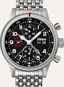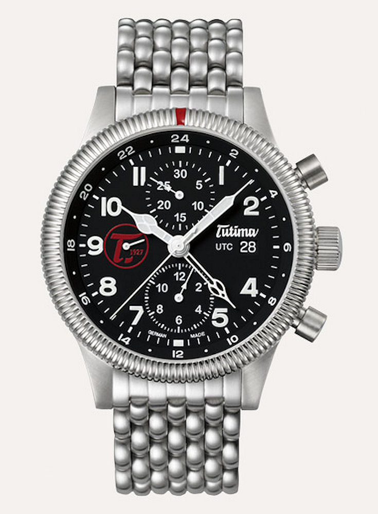 Tutima Flieger Grand Classic Chronograph UTC model 781-04. Black dial and matching color military style band. Powered by Swiss Valjoux 7754 Automatic chronograph movement with date calendar and Second Time Zone indicator variation. Stainless steel case with coin edge style rotating bezel and screw-down crown. Stainless steel bracelet