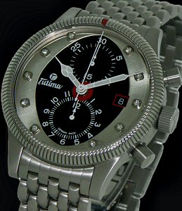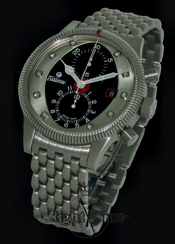 Big, bold and beautiful is the description of this Tutima Grand Classic Flieger military chronograph, with customized disk with 10 diamonds over black dial, luminous hands, housed in new 43mm steel satin finish case with Flieger steel bracelet