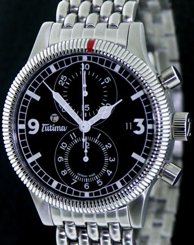 Tutima Grand Classic Flieger Limited Edition 781-18 chronograph, with black dial and over-sized sub-dials, luminous hands, housed in a 43mm steel satin finish case with very comfortable 7 link bracelet