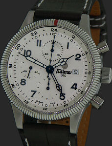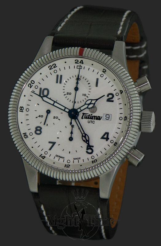 Tutima Flieger Grand Classic Chronograph UTC model 781-26. White dial. Powered by Swiss Valjoux 7750 Automatic chronograph movement with date calendar and Second Time Zone indicator variation. Stainless steel case with coin edge style rotating bezel and screw-down crown. Brown Alligator watch strap.
