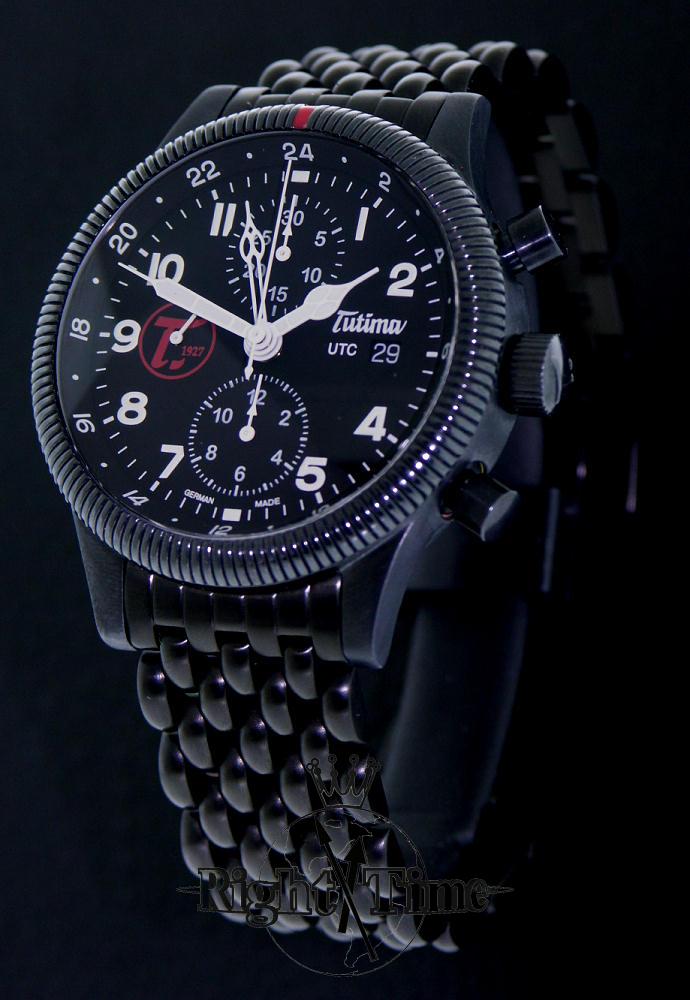 Tutima Flieger Grand Classic Chronograph UTC model 781-252 Black dial. Powered by Swiss Valjoux 7750 Automatic chronograph movement with date calendar and Second Time Zone indicator variation. Black PVD plated stainless steel case with coin edge style rotating bezel and screw-down crown. Black PVD stainless steel Flieger style bracelet.