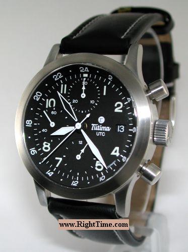 Refurbished Tutima Automatic chronograph watch from Tutima FX UTC Series. ETA Valjoux 7754 Swiss Automatic chronograph movement with date calendar and Second Time Zone indicator. Stainless steel case with plain bezel, screw-down crown and case back. Black dial with luminous hands and Arabic numerals. Black leather watch band. Available with metal bracelet.