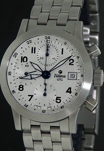 Tutima Automatic chronograph watch from Tutima FX UTC Series. ETA Valjoux 7750 Swiss Automatic chronograph movement with date calendar and Second Time Zone indicator. Stainless steel case with plain bezel, screw-down crown and case back. White dial with luminous hands. Stainless steel watch bracelet. Available with leather strap.