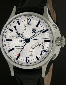 Perpetual Calendar. Pointer hand Date display. Day and month retrograde indicators.