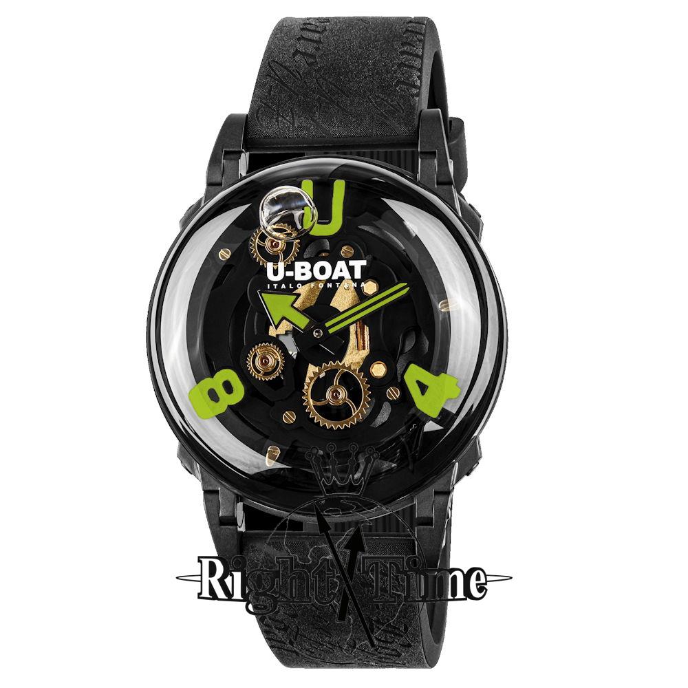 U-Boat by Italo Fontana U-65 watch model 3351 in 44mm black PVD plated stainless steel case. More fluid, more "hyper-rounded" design. Sapphire crystal. Grey skeletonized dial with green Super-LumiNova on hands and markers. Black silicone band. Water resistant to 50 meters. Powered by Ronda quartz movement