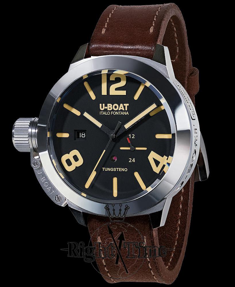 U-Boat Classico 50 Tungsteno Movelock model 8073 in stainless steel 50mm case. Powered by automatic movement modified to U-Boat specification with crown at 9 o`clock position. See through back. Black dial with visible ruby, superluminova hands, date, and 24-hours hand. Hand made brown leather band. Water resistant to 100 meters.