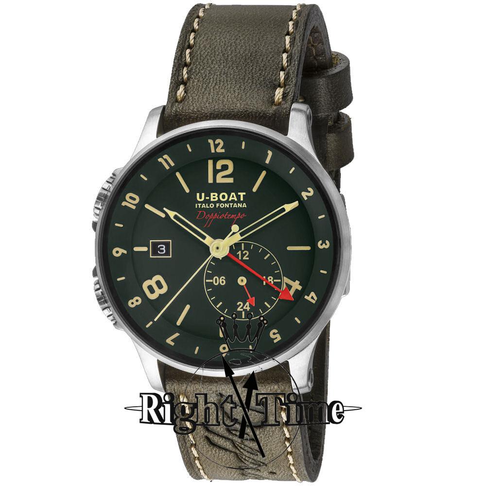 U-Boat 1938 Doppiotempo model 8500. Powered by automatic movement modified to U-Boat specification. Stainless steel case with observation back. Green dial with second time zone sub-dial. Leather strap. Water resistant to 100 meters.