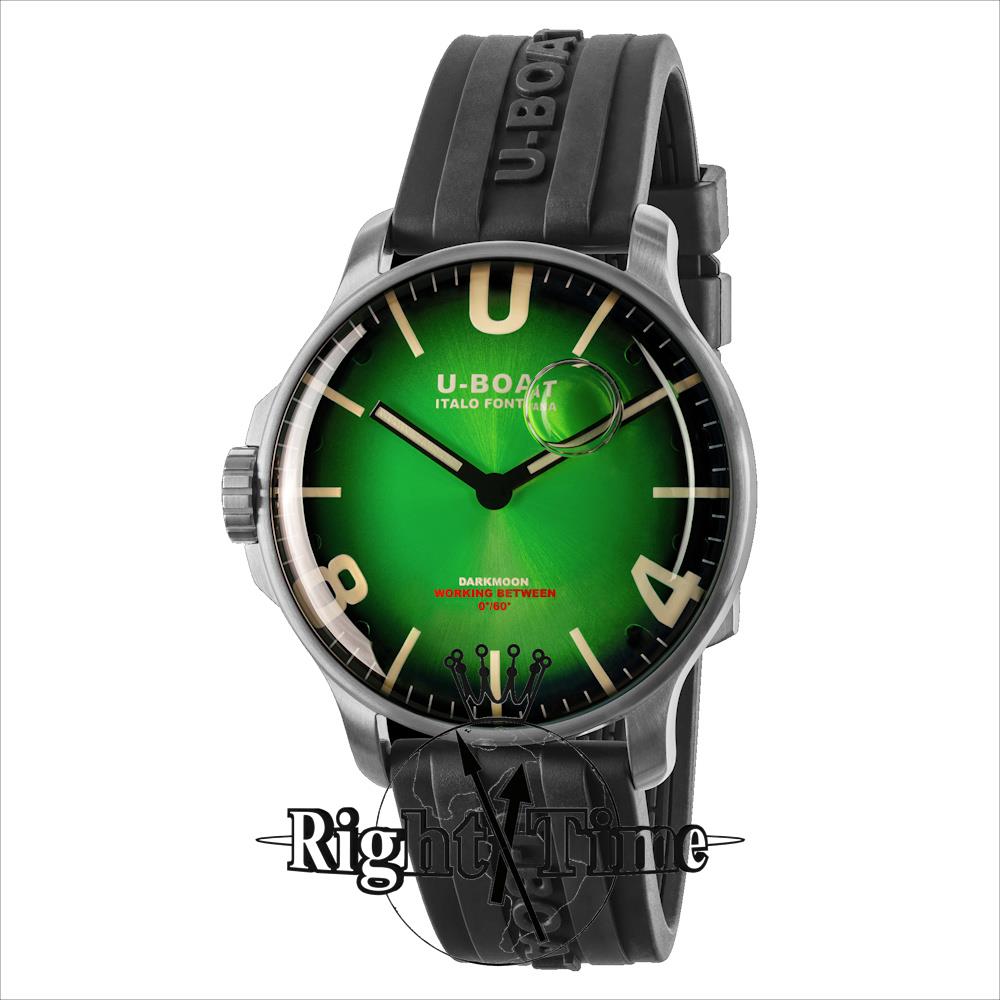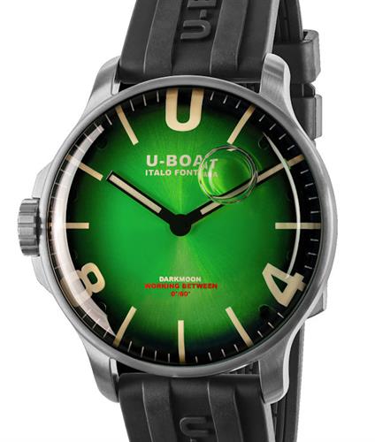 U-Boat Darkmoon 44mm Green Soleil model 8702/c Inspired by the dark side of the moon. Stainless steel case is completely filled with a special oil that emphasizes the green metallic dial with soleil finishing. Case back with locking ring system for quick battery replacement.