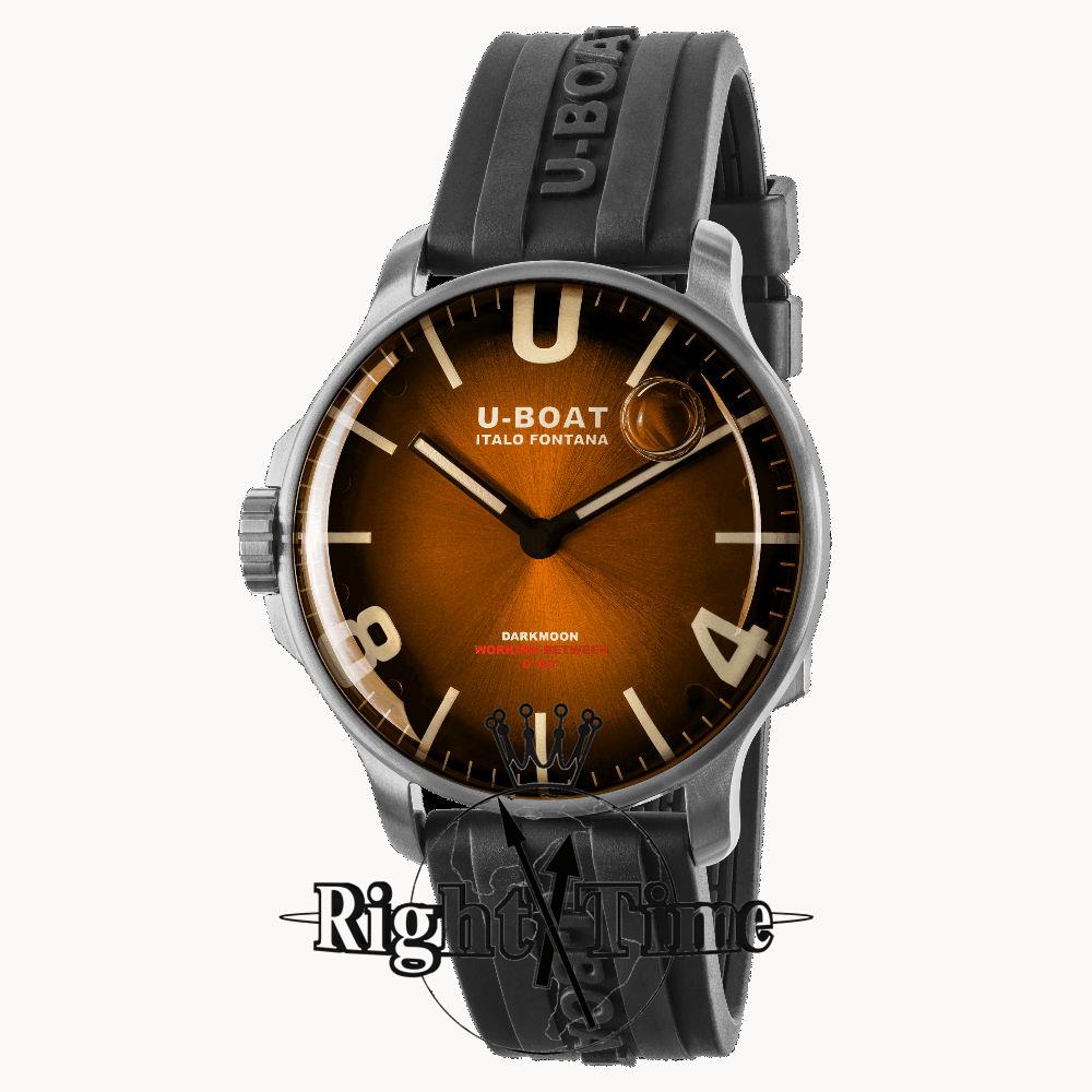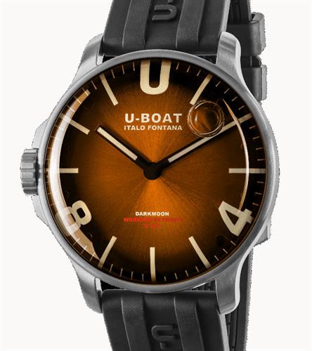 U-Boat Darkmoon 44mm Brown Soleil model 8703/B Inspired by the dark side of the moon. Stainless steel case is completely filled with a special oil that emphasizes the brown metallic dial with soleil finishing. Case back with locking ring system for quick battery replacement.