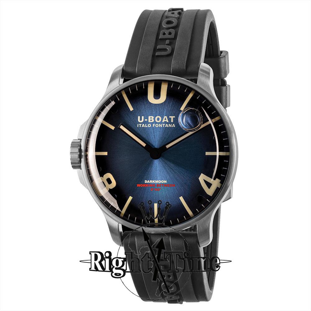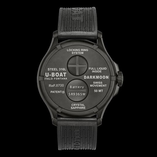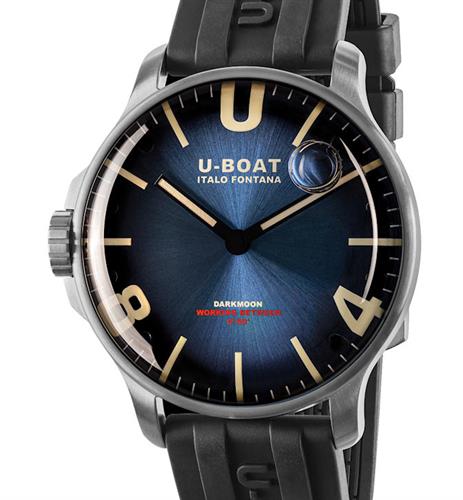 U-Boat Darkmoon 44mm Blue Soleil model 8704/B Inspired by the dark side of the moon. Stainless steel case is completely filled with a special oil that emphasizes the blue metallic dial with soleil finishing. Case back with locking ring system for quick battery replacement.