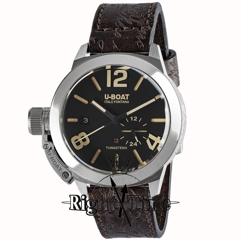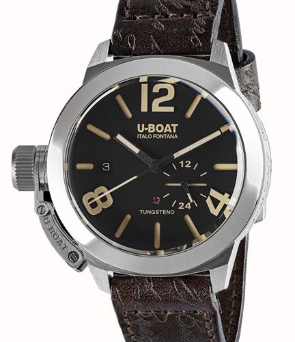 U-Boat Classico model 8893 in stainless steel 42 mm case with polished bezel powered by automatic movement with crown at 9 o`clock position. Black dial with beige Arabic numerals and date calendar. Sapphire crystal. Brown leather band. Water resistant to 100 meters.