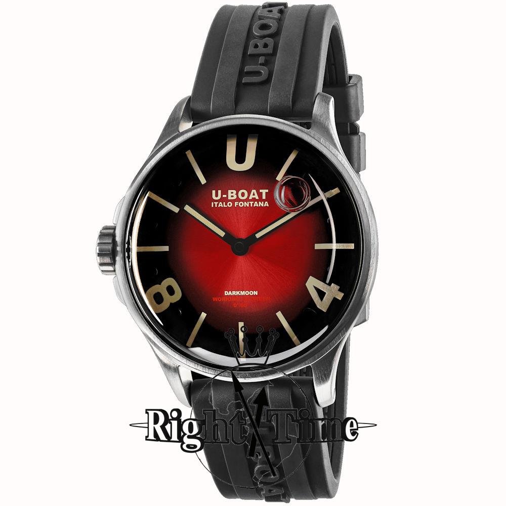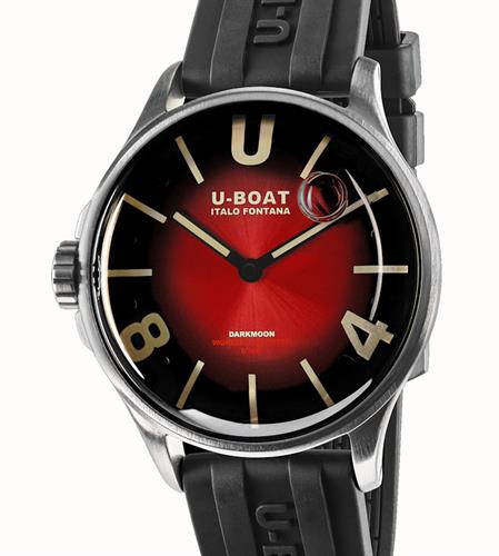 U-Boat Darkmoon 40mm Red Soleil model 9500 Inspired by the dark side of the moon. Stainless steel case is completely filled with a special oil that emphasizes the red metallic dial with soleil finishing. Case back with locking ring system for quick battery replacement.