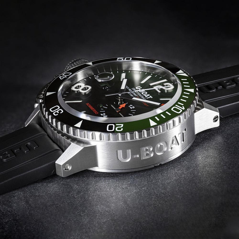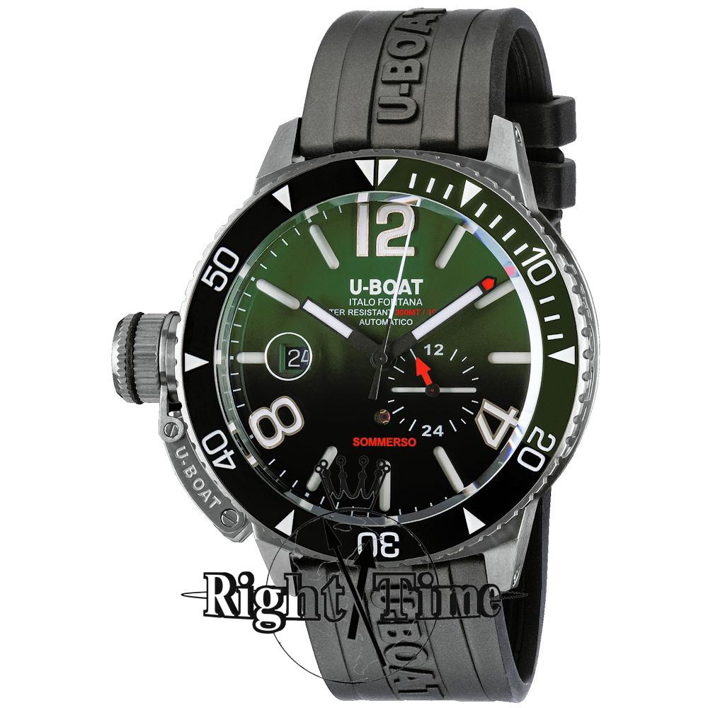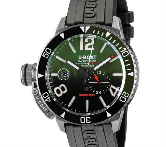 U-Boat Classico Sommerso model 9520. Powered by automatic movement modified to U-Boat specification with crown at 9 o`clock position. Green and black dial with visible ruby, large Arabic markers, superluminova hands, date, and 24-hours hand. Stainless steel case. Black rubber strap. Water resistant to 300 meters.