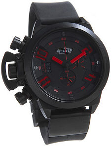 Welder K24 chronograph model 3303. Black plated 316L 48mm stainless steel case. Black dial with red color assents. Black rubber strap with steel plates and butterfly buckle.