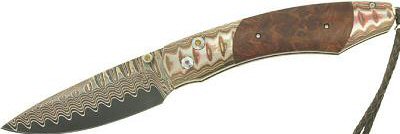 William Henry Spearpoint B12-Jackson Creek knife features `Copper Wave` damascus blade in the heat-browned `Wave` mokume frame with Amboyna burl inlay