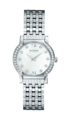 Wittnauer Lady wrist watch from Wittnauer Orpheum Collection. Swiss quartz movement, satin and polish finished stainless steel round case with diamond bezel, white Mother-of-Pearl dial with Roman numerals and diamond markers, sapphire crystal, polished stainless steel watch bracelet with center opening deployment clasp.