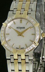 Wittnauer Warwick Collection. 18 diamonds on round stainless steel case with gold tone accents, stainless steel two tone watch bracelet. White Mother-of-Pearl dial.