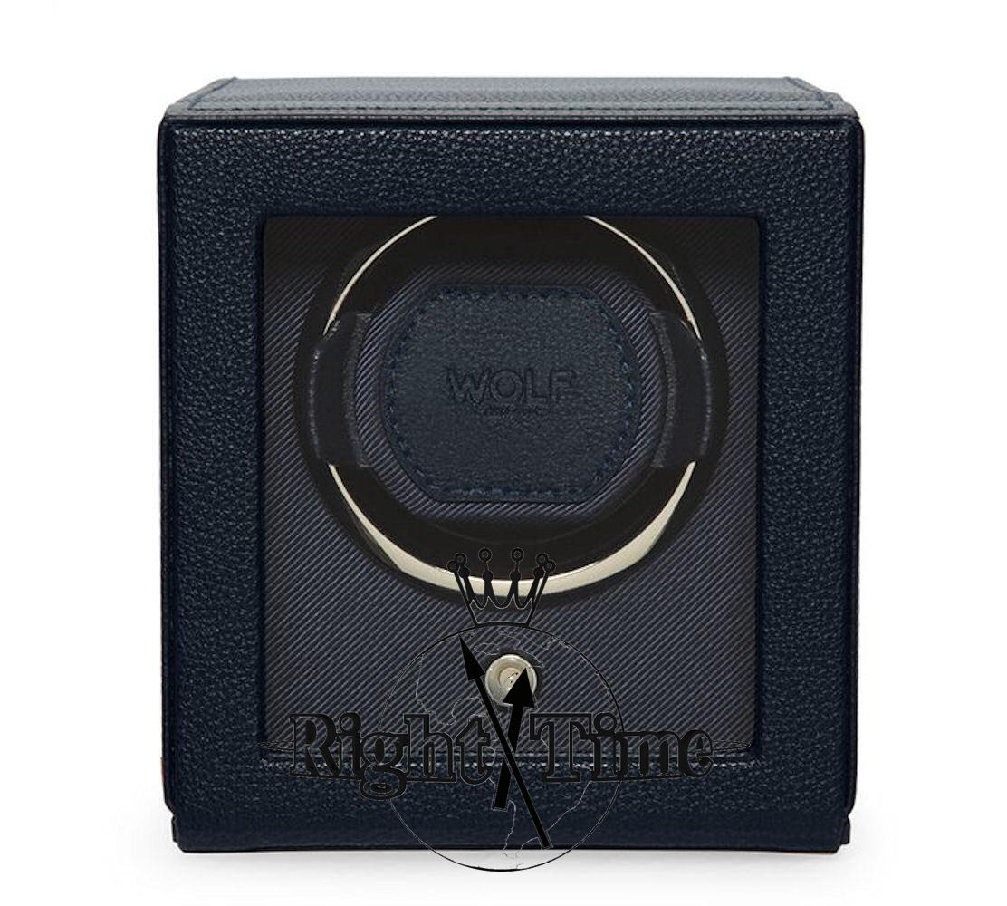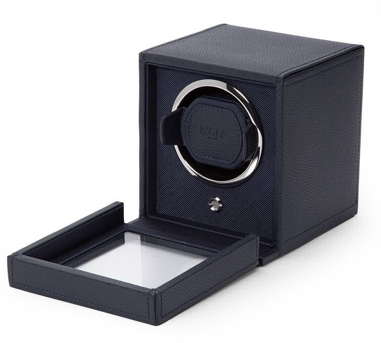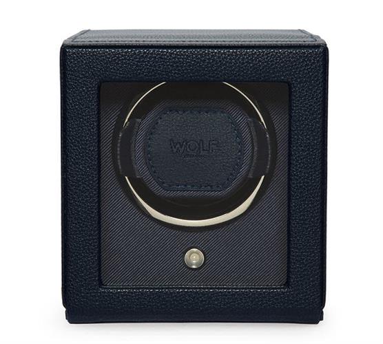 Wolf Cub Winder with Cover. Size: 5.25" L X 6" W X 5.75" H. Navy blue color leather