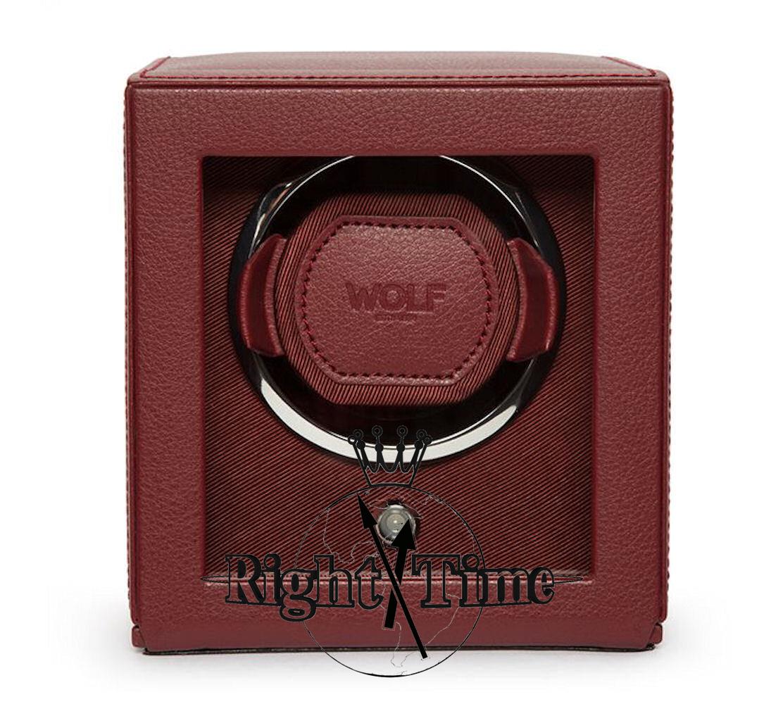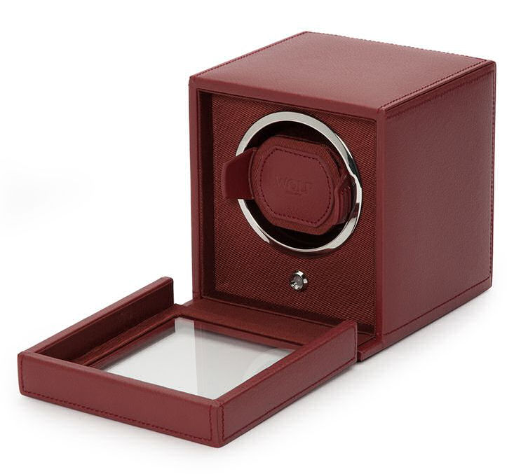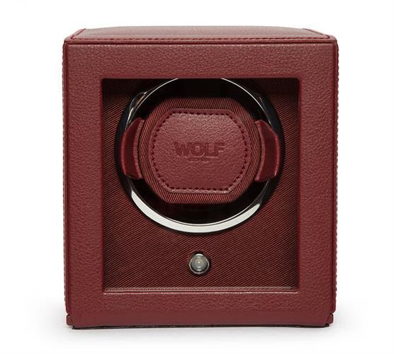 Wolf Cub Winder with Cover. Size: 5.25" L X 6" W X 5.75" H. Borgeaux color leather