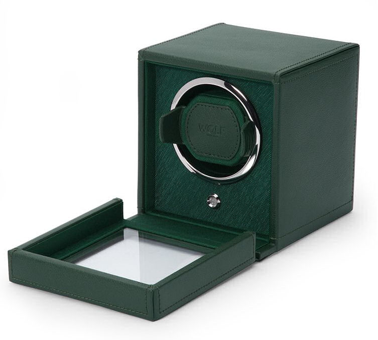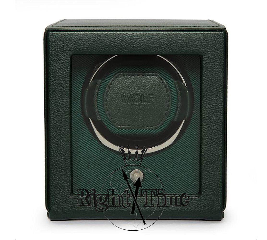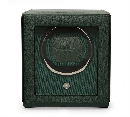 Wolf Cub Winder with Cover. Size: 5.25" L X 6" W X 5.75" H. Green color leather