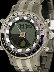 Yes watch model U100.4 from Yes Zulu Collection. Titanium case and watch bracelet. Swiss Quartz Analog/Digital movement. Functions: Alarm; Hours - Minutes - seconds in AM/PM or 2400 mode; Year - week# - DOY ( day of year) - longitude/latitude; Automatically adjusts for DST, which can be manually over-ridden; and many more