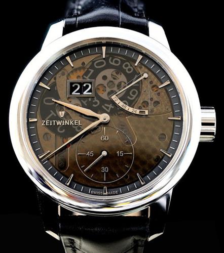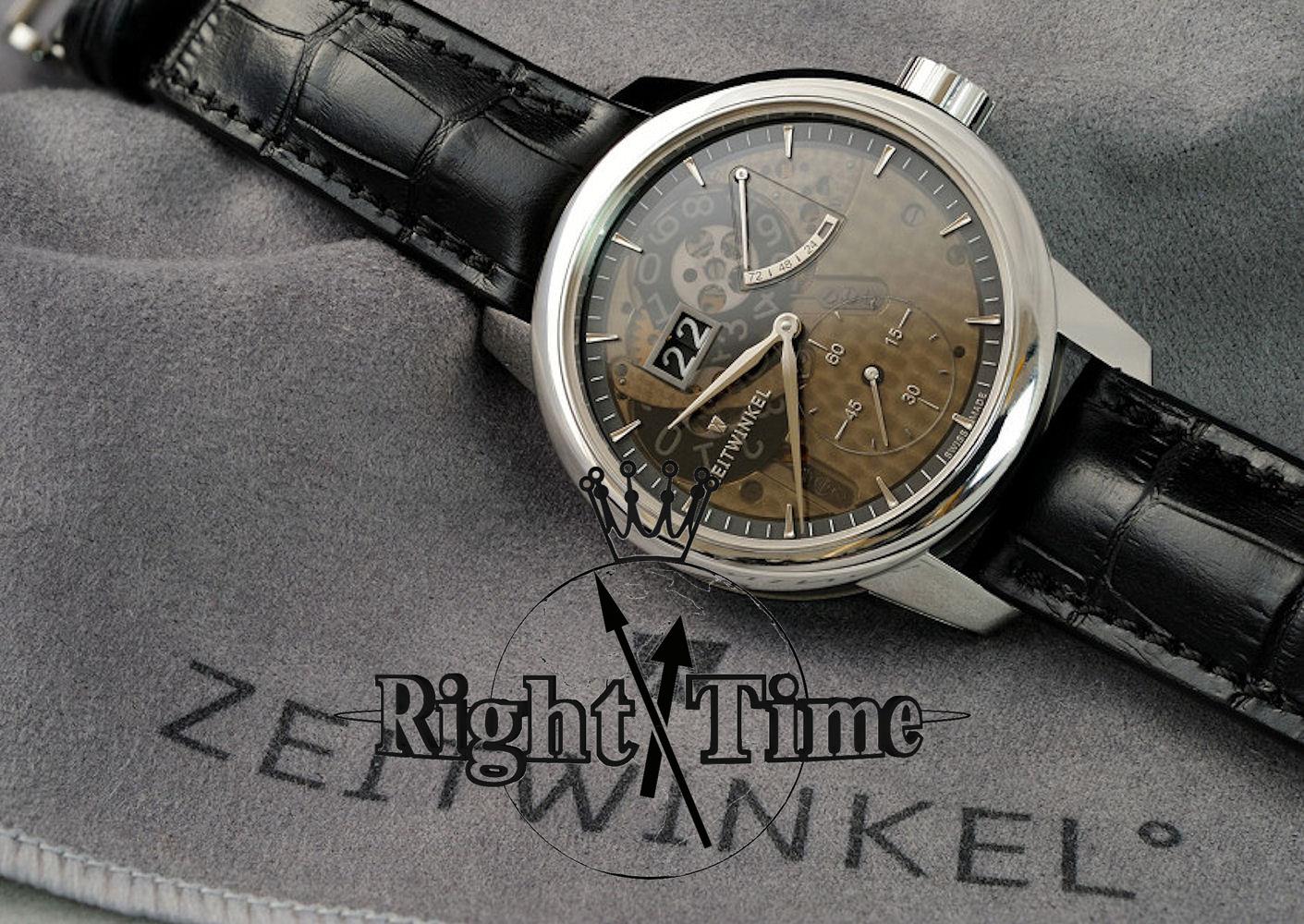All Swiss made Zeitwinkel model "273o Saphir Fume (Smoked Sapphire) Crystal Dial" with Large Date, small seconds and power reserve indicator, powered by in-house manufactured ZW0103 49 jewels automatic movement with 72 hour power reserve, semi-transparent sapphire crystal gives the view on the movement, black leather strap with butterfly style deployant buckle