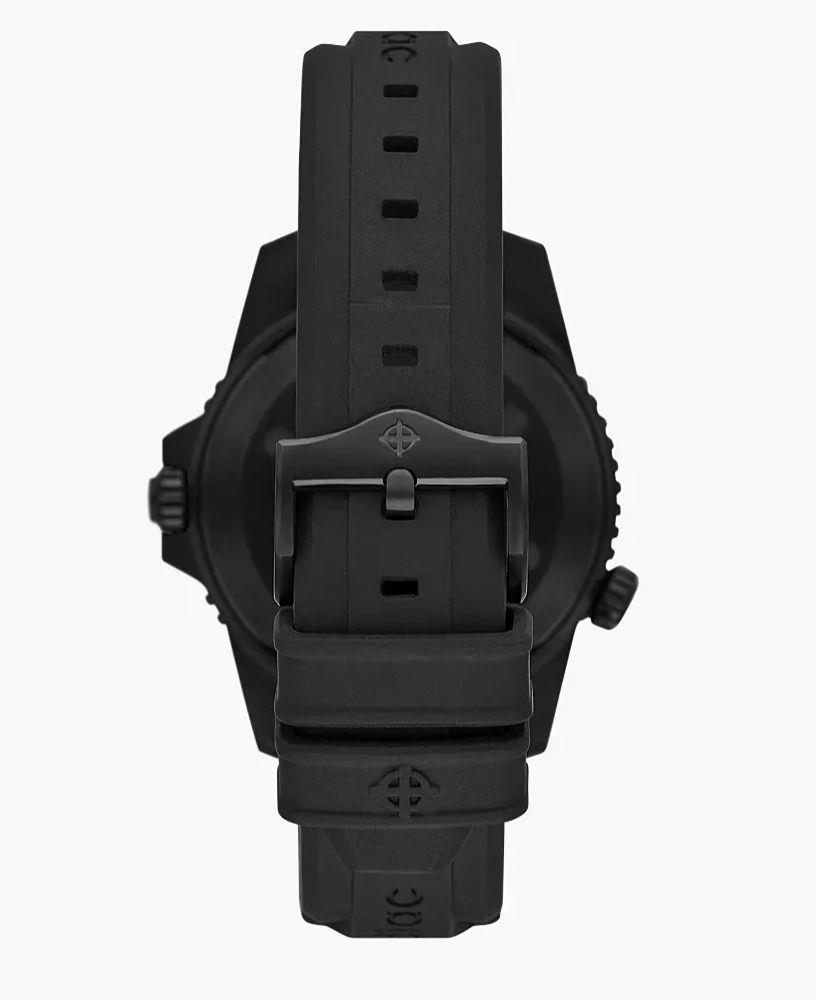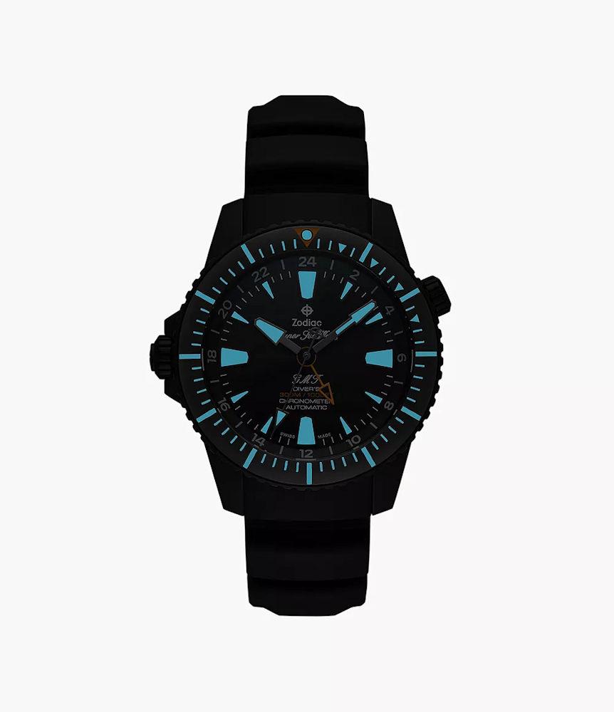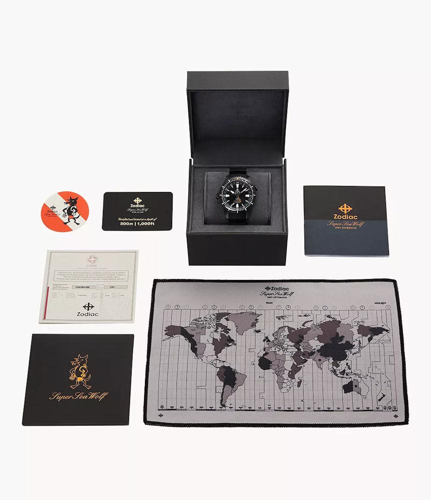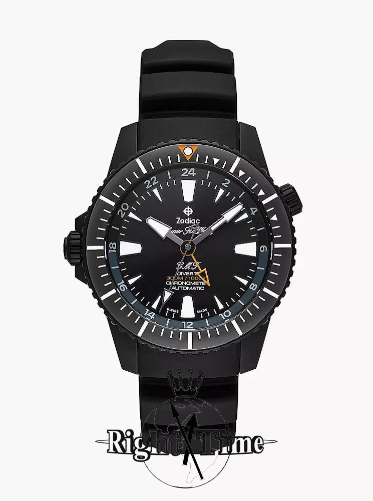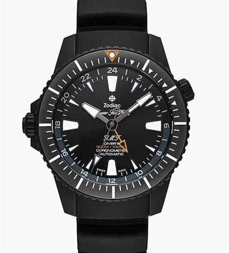 Zodiac Super Sea Wolf Pro-Diver GMT Steel watch model ZO3557. Powered by automatic chronometer movement. Black plated stainless steel case with black rubber band. Black dial and rotating bezel. 24-hours GMT hand. Water resistant to 200 meters.