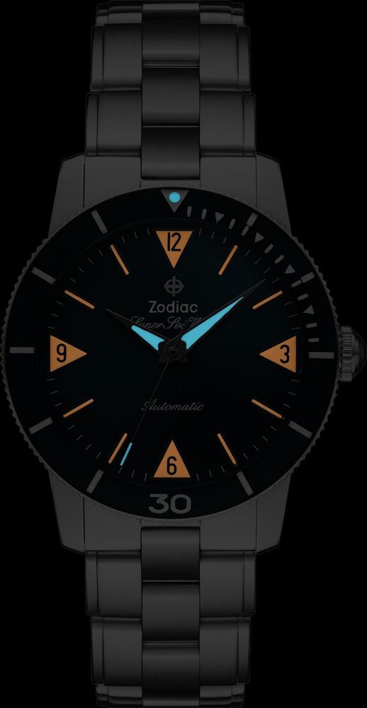Zodiac Super Sea Wolf Sea Foam Automatic watch model ZO9211. Powered by automatic movement. Stainless steel 316L case with bracelet. Blue dial with large luminous blowing orange markers. Rotating bezel. Water resistant to 200 meters.