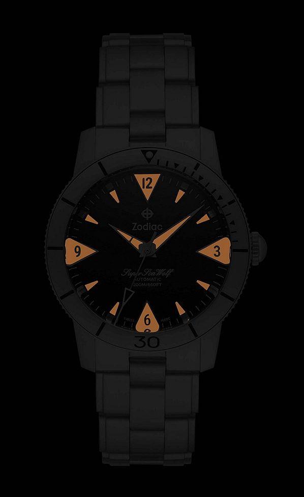 Zodiac Super Sea Wolf 53 Skin Automatic watch model ZO9213. Powered by automatic movement. Stainless steel 316L case and bracelet. Black dial with large luminous blowing orange markers. Rotating bezel. Water resistant to 200 meters.