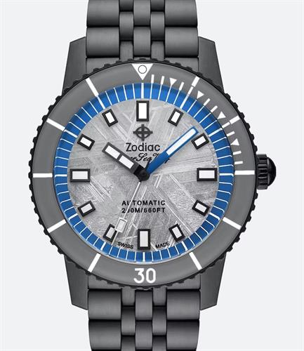 Zodiac Super Sea Wolf Meteorite Automatic watch model ZO9293. Powered by automatic movement. Grey DLC coated stainless steel 316L case and bracelet. Grey textured color dial with blue outer ring, luminous hands and markers. Rotating grey/white bezel. Water resistant to 200 meters. Limited Edition of 182 pieces