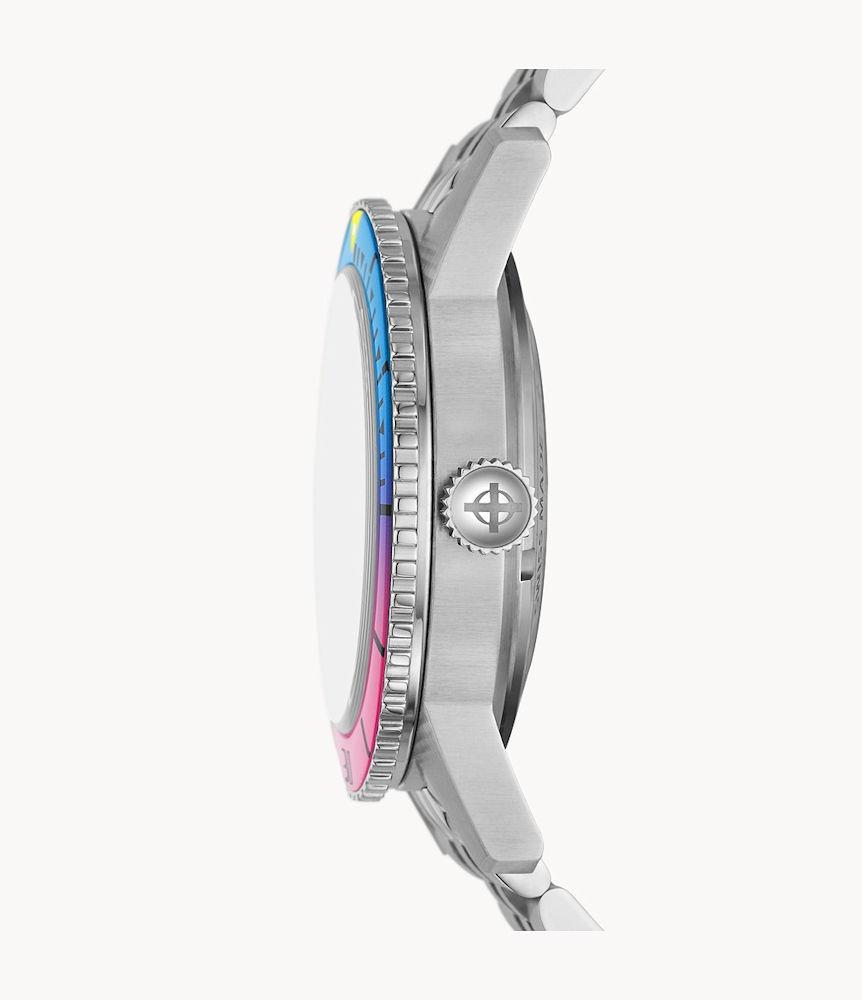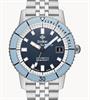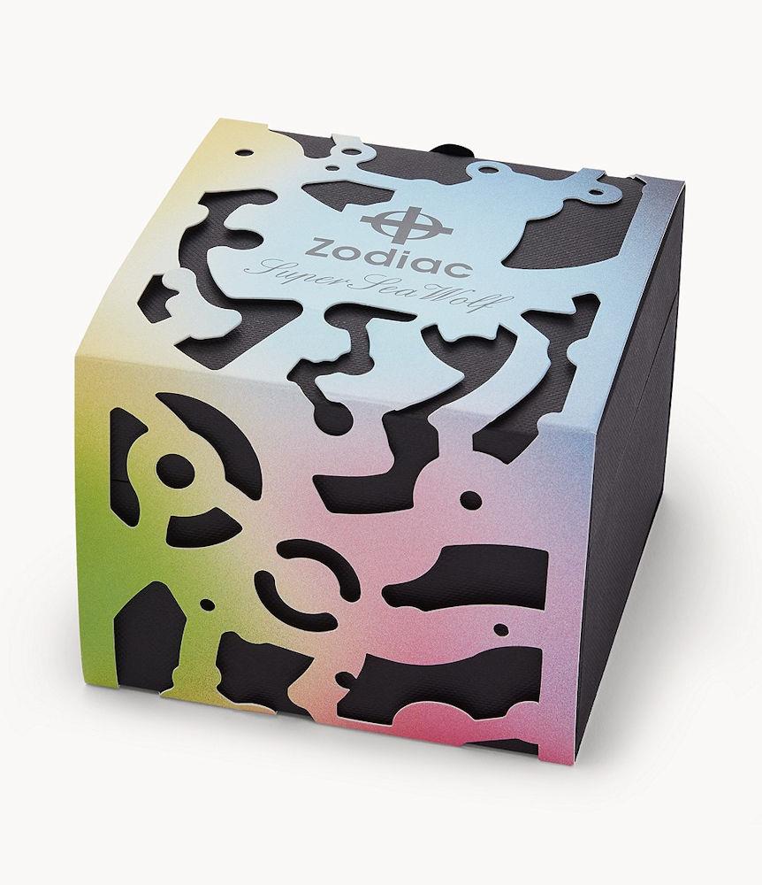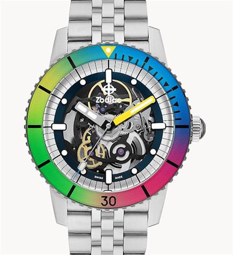 Zodiac Super Sea Wolf Skeleton 6-15 Automatic watch model ZO9298. Powered by automatic movement. Stainless steel 316L case and bracelet. Skeletonized blue and silver dial. Multi-color rotating bezel. Water resistant to 200 meters.