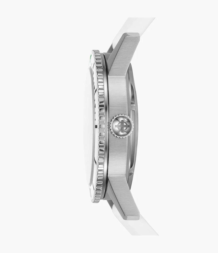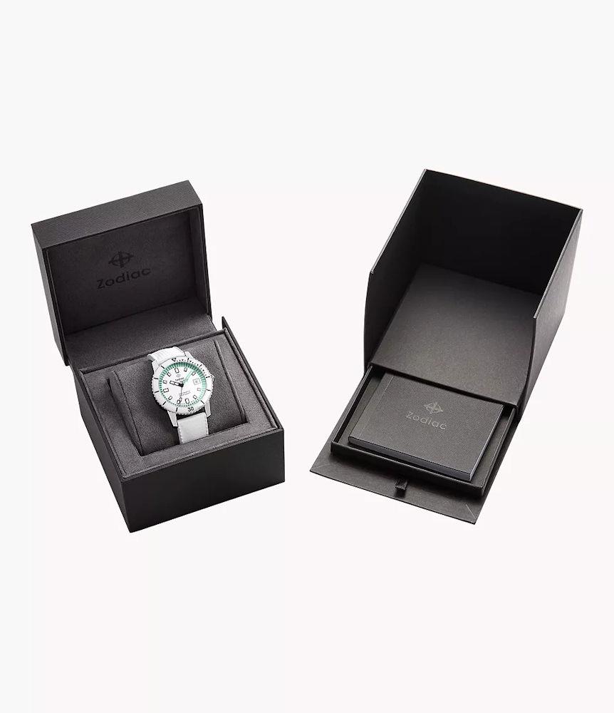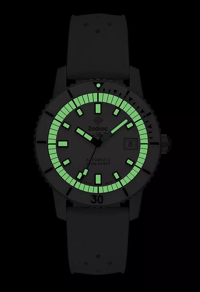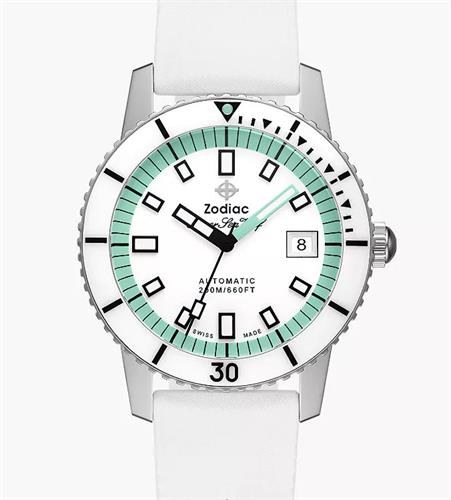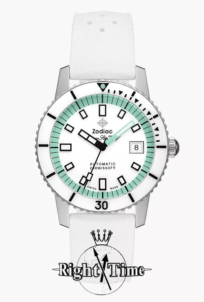 Zodiac Super Sea Wolf Compression Automatic watch model ZO9309. Powered by automatic movement. Stainless steel 316L case with white rubber band. White color dial with date calendar, green outer ring, luminous hands and markers. Rotating 60-minutes white bezel. Water resistant to 200 meters.