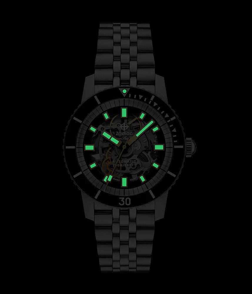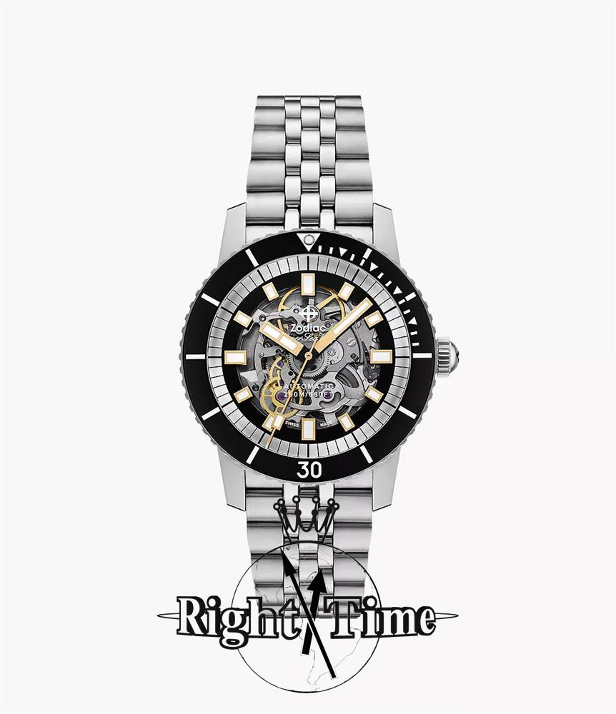 Zodiac Super Sea Wolf Compression Diver Stainless Steel Automatic watch model ZO9319. Powered by automatic movement. Stainless steel 316L case with bracelet. Skeleton dial, luminous hands and markers. Rotating black bezel. Water resistant to 200 meters.
