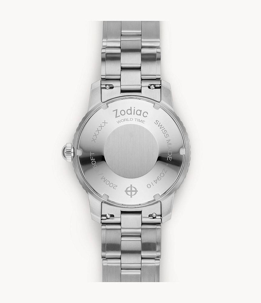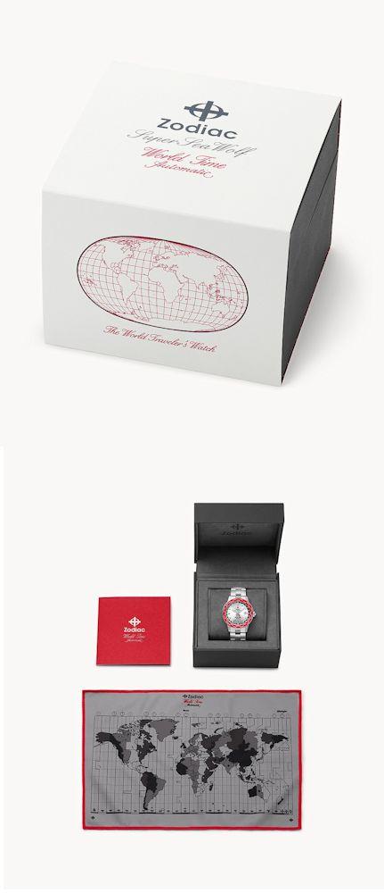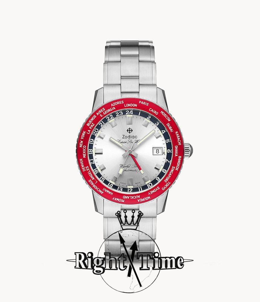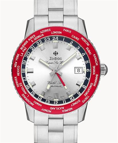 Zodiac Limited Edition Super Sea Wolf World Time Automatic watch model ZO9410. Powered by automatic movement. Stainless steel 316L case and bracelet. Silver color dial with date calendar, second time-zone indicator, luminous hands and markers. Red rotating 24-hours bezel with world cities. Water resistant to 200 meters.