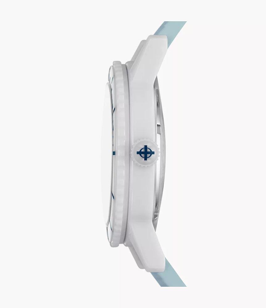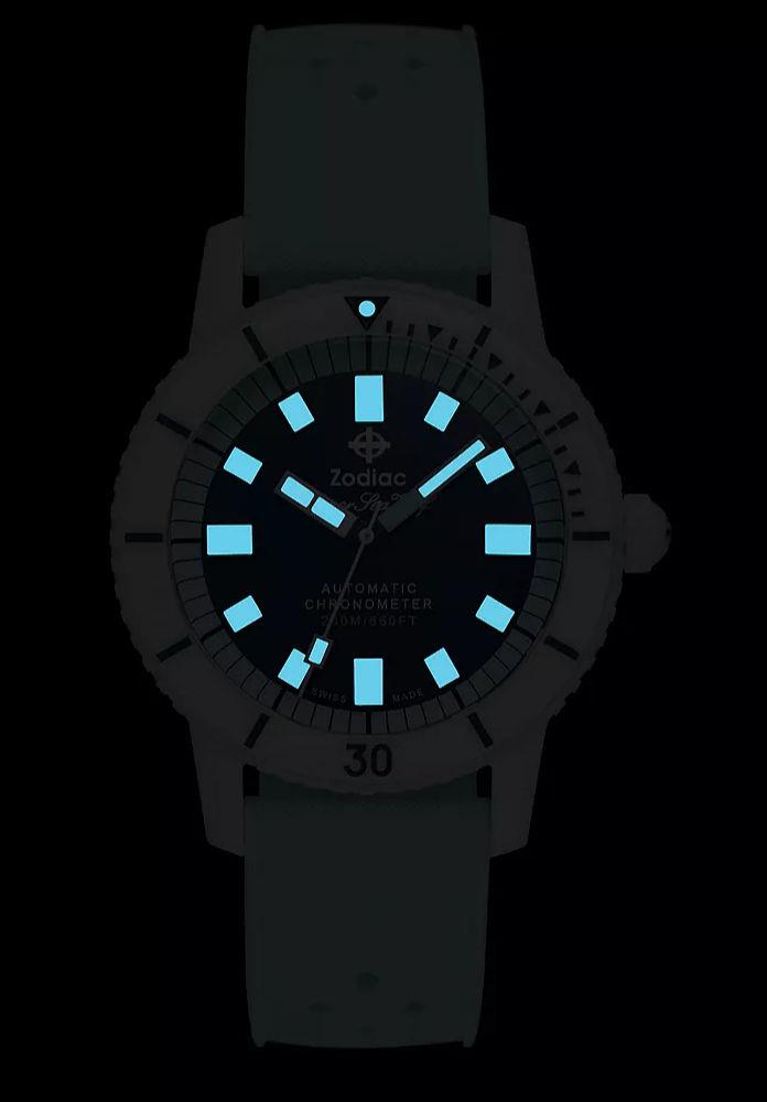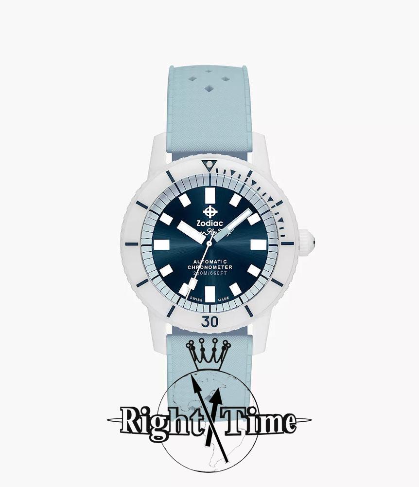 Zodiac Super Sea Wolf factory model ZO9590. Powered by a Swiss made automatic movement. White ceramic case and bezel with high polished finish. Blue dial with super luminova filled hands and markers. Sapphire crystal. Blue color Italian rubber strap. Water resistant to 200 meters.