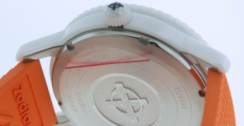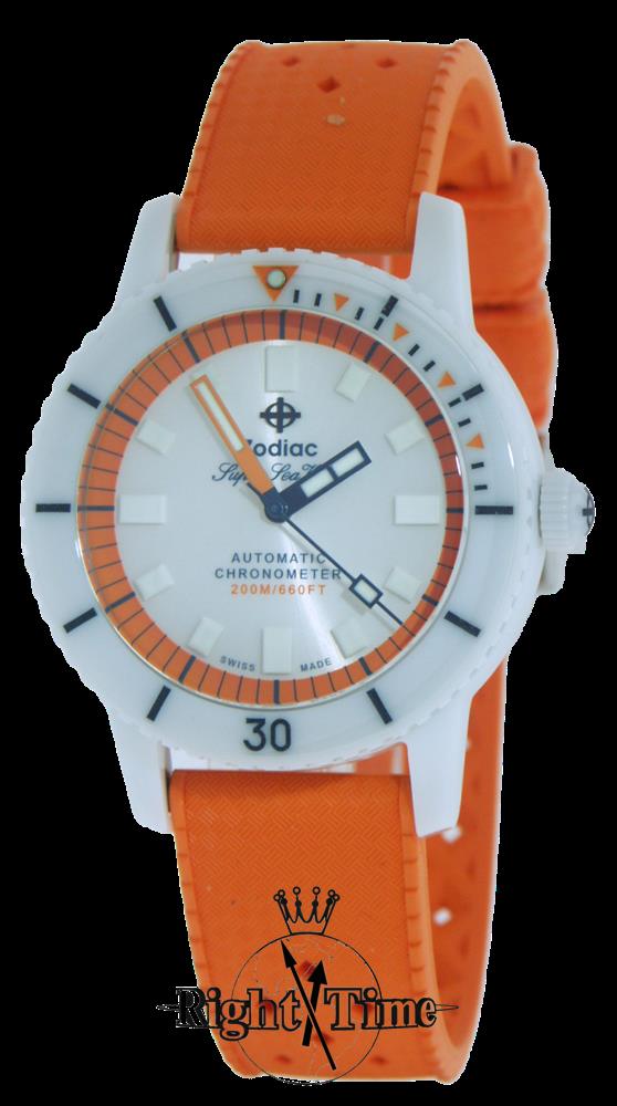 Zodiac Super Sea Wolf factory model ZO9591. Powered by a Swiss made automatic movement. White ceramic case and bezel with high polished finish. White dial with super luminova filled hands and markers. Sapphire crystal. Orange color Italian rubber strap. Water resistant to 200 meters.