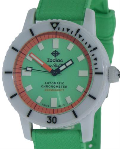 Zodiac Super Sea Wolf factory model ZO9592. Powered by a Swiss made automatic movement. White ceramic case and bezel with high polished finish. Mint green dial with super luminova filled hands and markers. Sapphire crystal. Italian rubber strap. Water resistant to 200 meters.